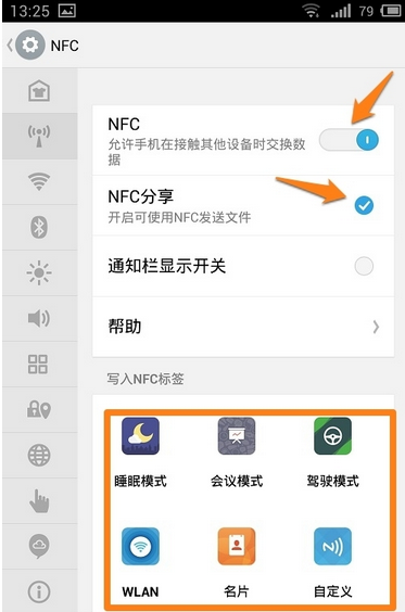 2、比如我們打開睡眠模式,將手機設置為飛行模式,如果你有其他的偏好,也可以自行修改添加。設置好之后,手機背面掃描一下NFC標簽,就會提示“成功寫入標簽”的字樣了。